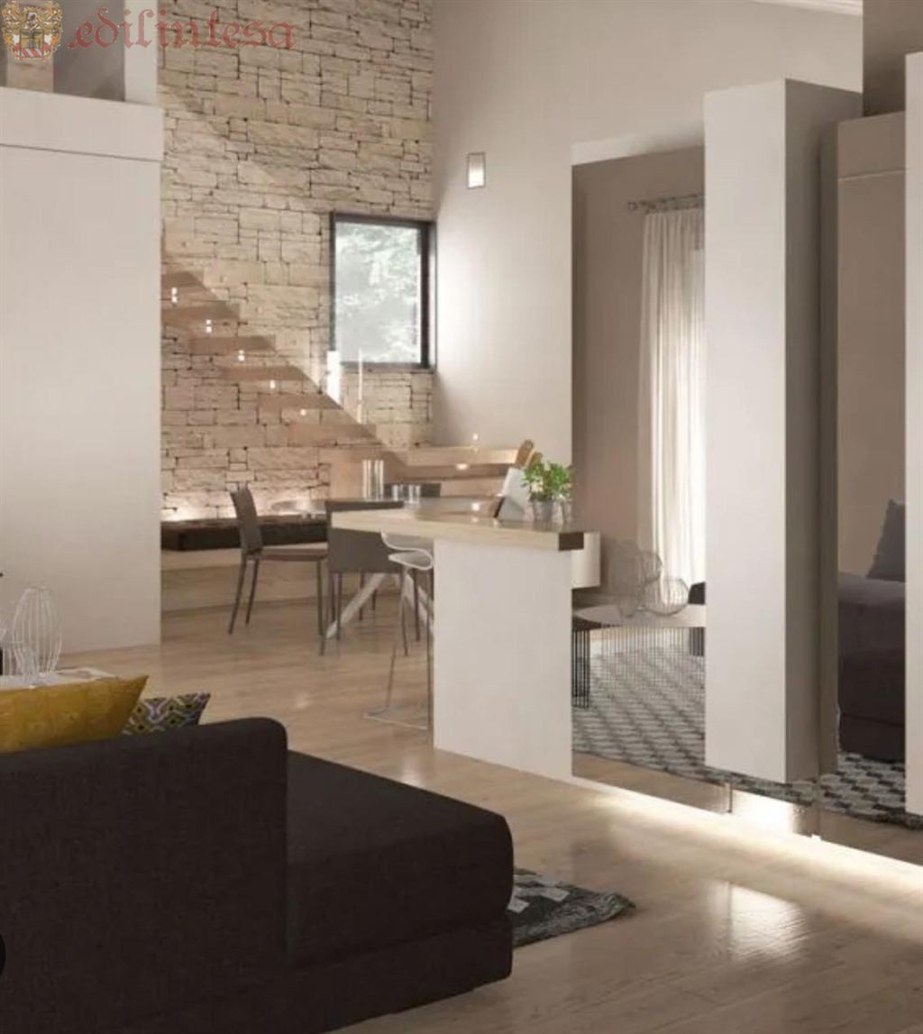 Al piano terra da ingresso con un luminoso soggiorno che da accesso al giardino (corredato da un ampio portico), oltre ad una cucina a vista e ad un servizio, dal piano terra si può accedere direttamente anche al box singolo.
